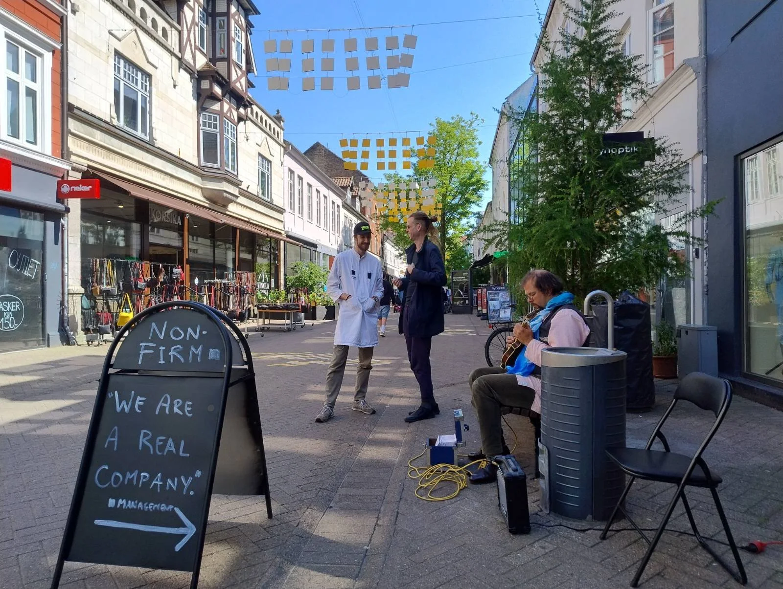 NON-FIRM UNINCORPORATED (N-FU) is a Danish company exploring the capabilities and limitations of capitalism, market forces, and commerce. We established our first branch in 2025 in a large (400 square meter) storefront on a main walking street in Odense C, Denmark at Kongensgade #26. N-FU practices reverse capitalism, by giving money away freely. N-FU practices unconventional marketing by having a black square as a logo, and offering free Non-Firm tattoos. N-FU offers a place of rest, an oasis in the city center, in the midst of a sea of commercial activities.